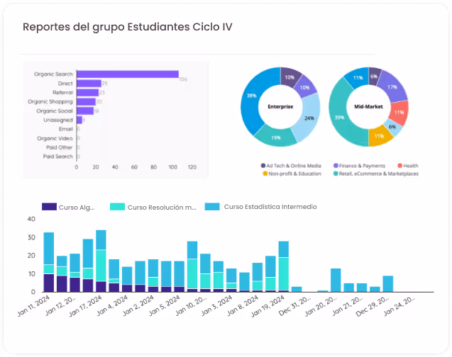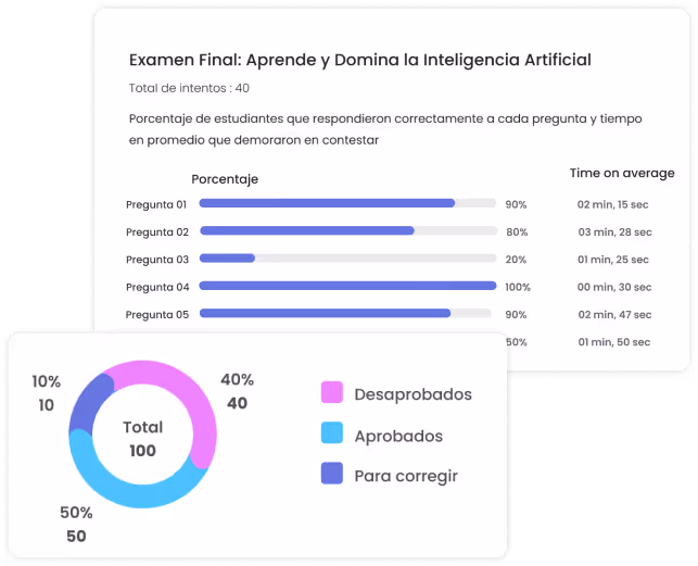 Desde el desempeño de un estudiante en un curso hasta el progreso colectivo de un grupo, los reportes a un clic te ofrecen datos organizados y listos para analizar en tiempo real.