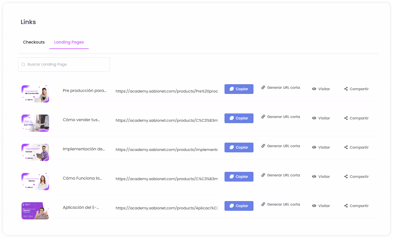 Accede rápidamente a los enlaces de tus landing pages, formularios, checkouts y más. Facilita la gestión de tus recursos y asegúrate de tener todo a la mano para tus campañas de marketing.