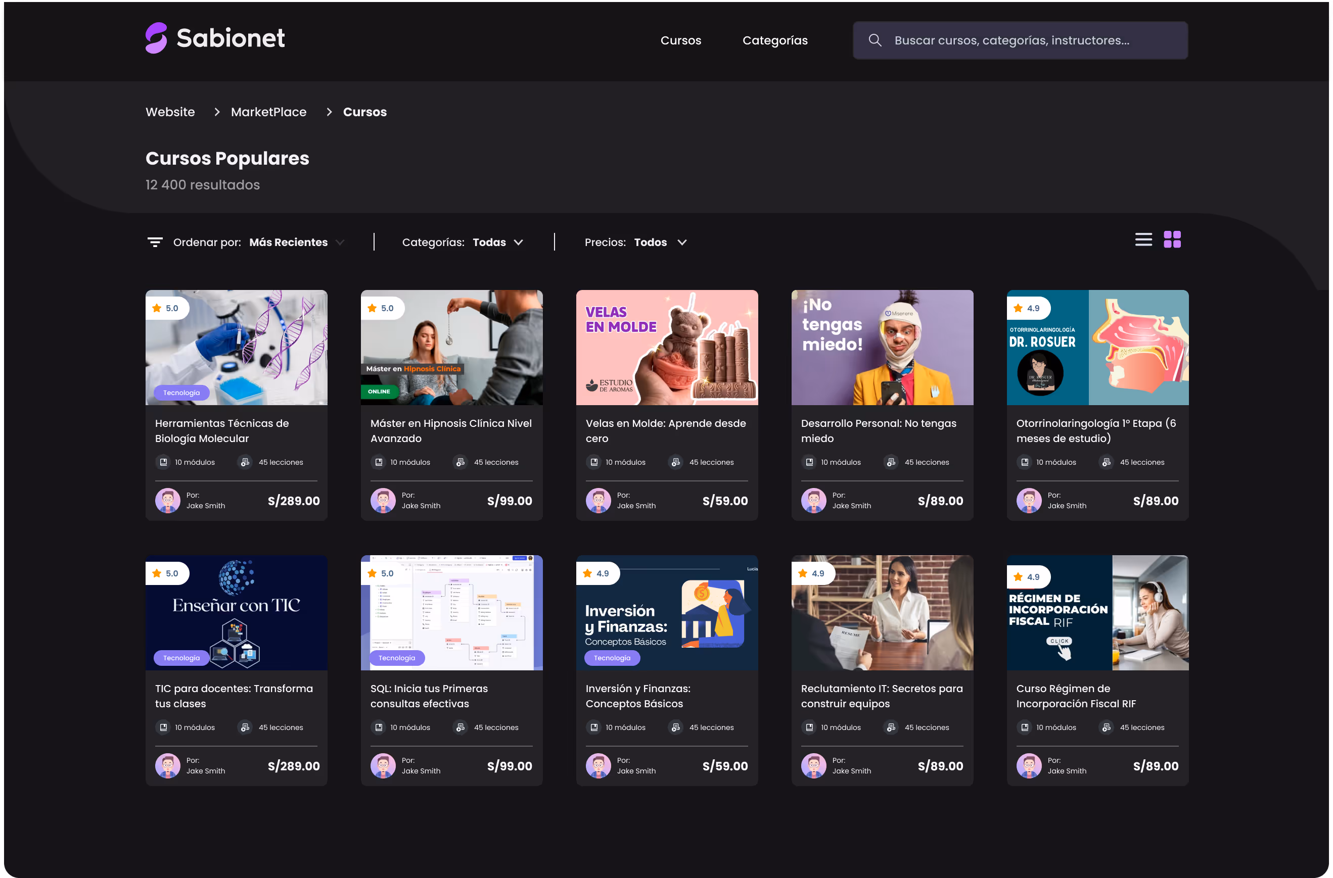 El Marketplace de Sabionet es el espacio donde tu sabiduría encuentra nuevas oportunidades. Aquí, cada creador de cursos mantiene su propia marca y estilo, sin estar bajo el nombre de Sabionet.